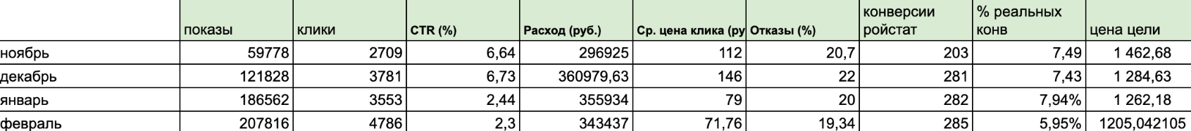 Ниша довольно конкурентная и сейчас мы увеличили бюджет практически в 2 раза. Также существует сезонность в нише, которая накладывает свой отпечаток на продвижение. При этом нужное количество лидов нам удается собирать ежемесячно.
