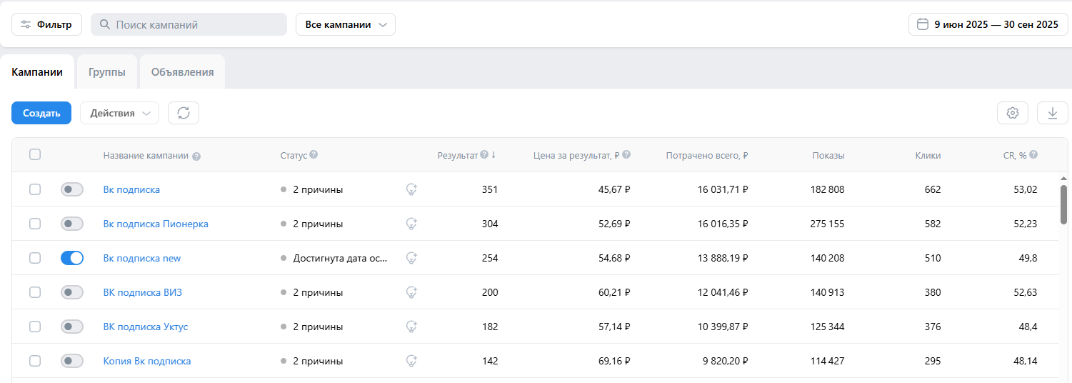 Здесь вы можете видеть результаты за несколько месяцев работы: при бюджете в 78199 руб получено 1433 подписчика по цене 55 руб за одного подписчика
